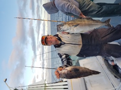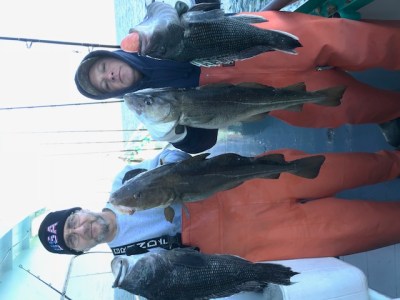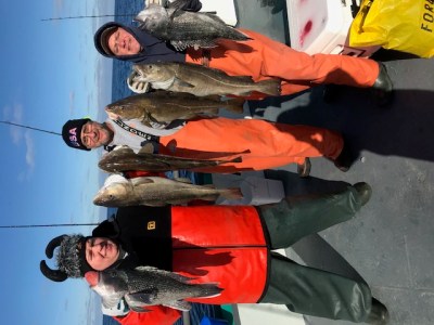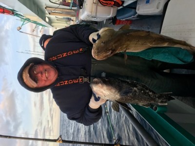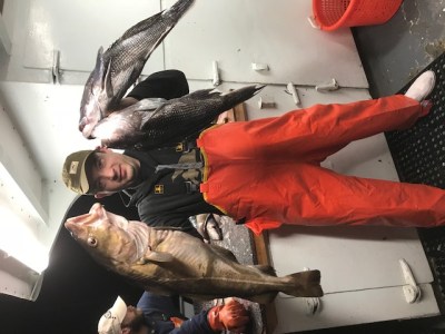 Captain Steven Sr. reports that on day one he decided to hit the Wrecks knowing that on Sunday the weather was going to change for the worst. The Wrecks were absolutely on fire, H.B.R, ( you hit bottom and reel) in Cod, Jumbo Sea bass and Pollack. We landed Cod to over 20lbs, Sea Bass to 6.5lbs and Pollack to 15lbs. All in all we had very good fishing for day one.